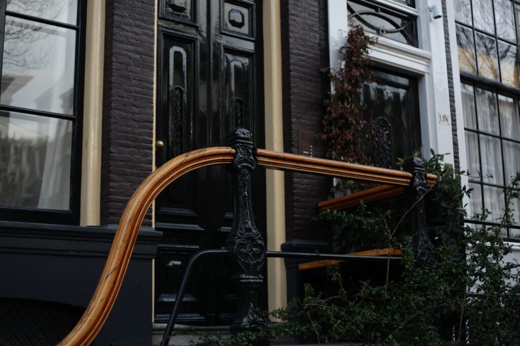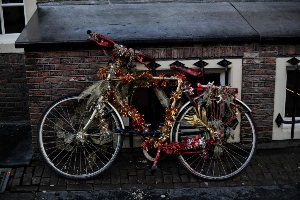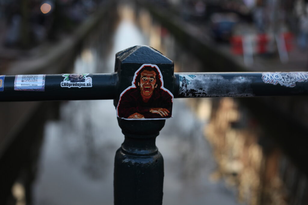 Street photography in Amsterdam is not about spectacle. It is about patience. It is about noticing the small things that build the atmosphere of a place: a decorated bicycle leaning against a brick wall, a glowing window in the evening light, a sticker placed on a metal railing overlooking the canal.