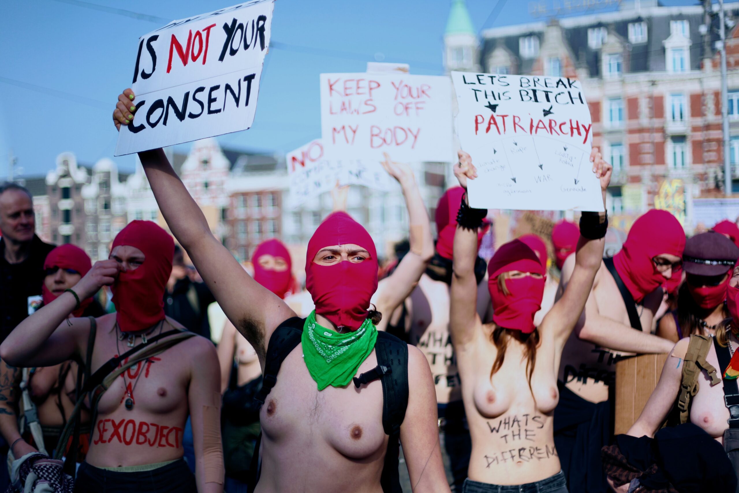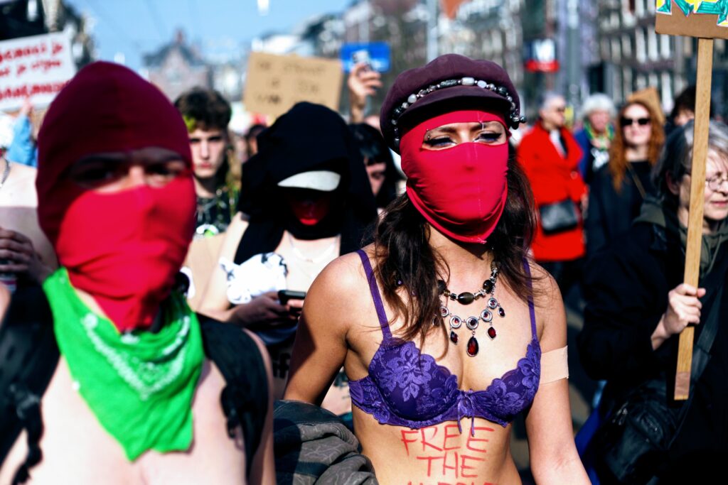 Nude Protest on the Streets of Amsterdam. Pink Masks and Anger During the Feminist March